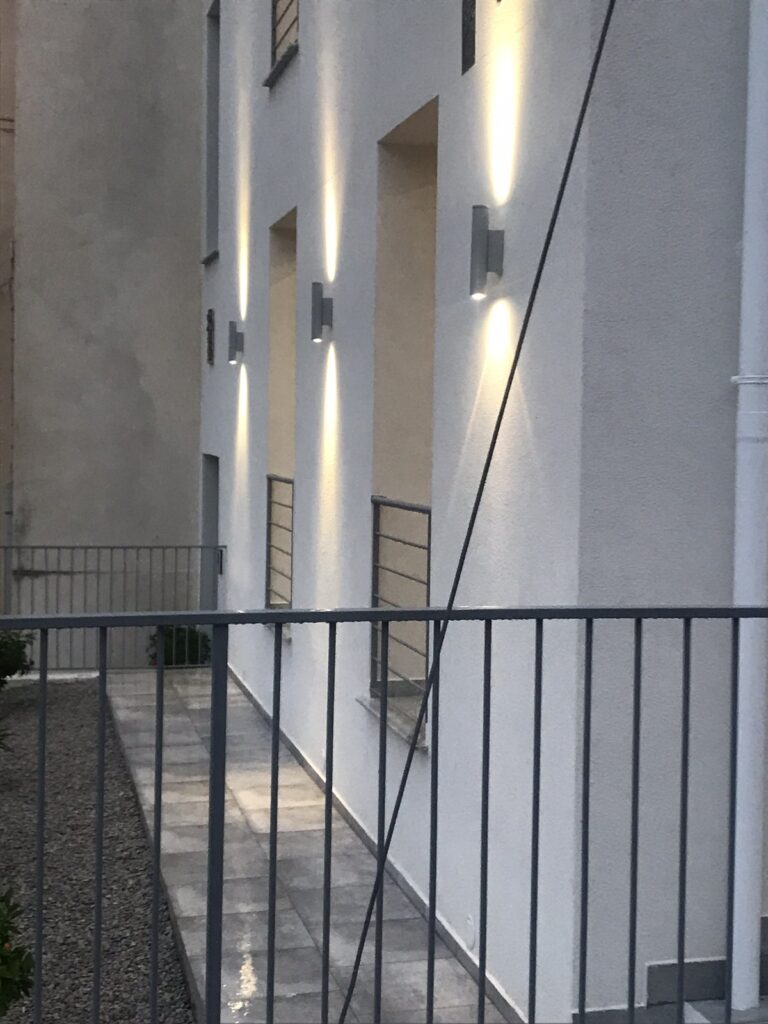 Sono state apportate sostanziali modifiche ai prospetti con l’allargamento delle finestre realizzando dei balconi a petto con ampie aperture in alluminio color acciaio. Il tutto per dare un taglio “contemporaneo” all’edificio oggetto dell’intervento e per garantire una migliore e più uniforme illuminazione degli ambienti.